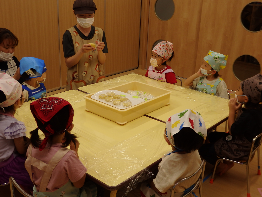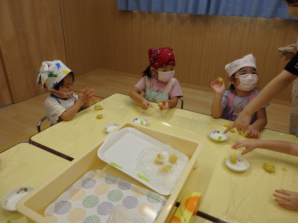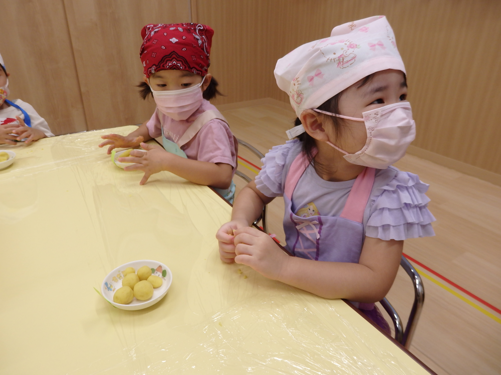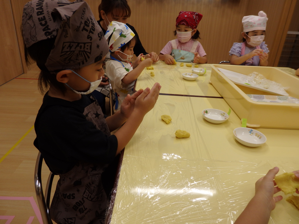 今日は、3歳児さんの食育で、スイートポテト作りをしました。